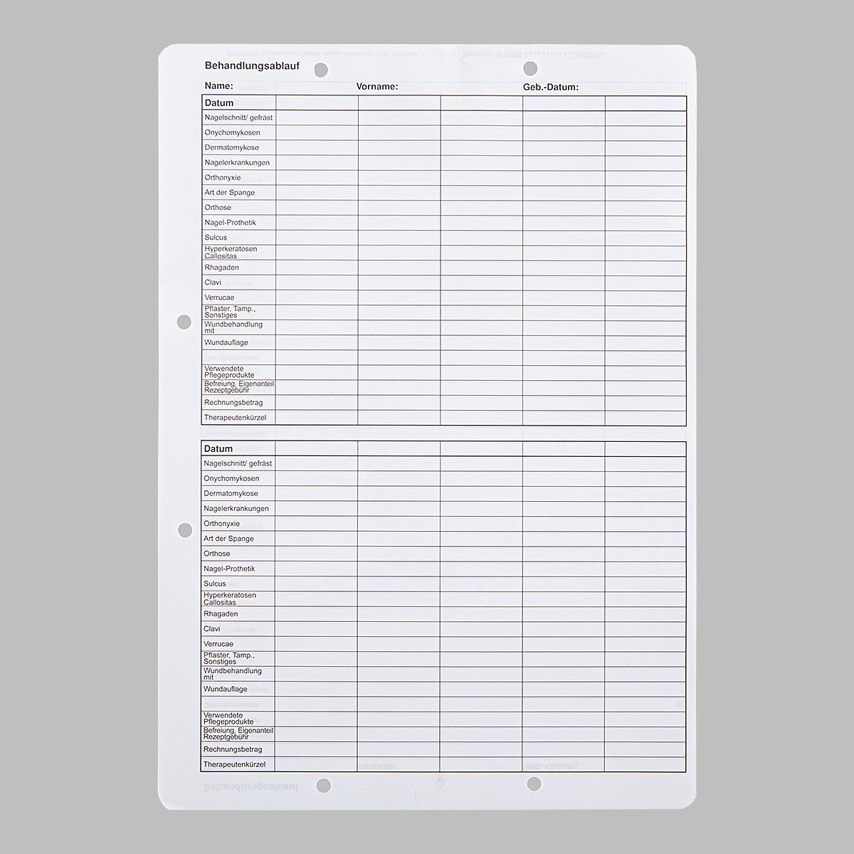 Der Behandlungsbogen kann als Ergänzungsbogen in die Podologiekarte geheftet werden.