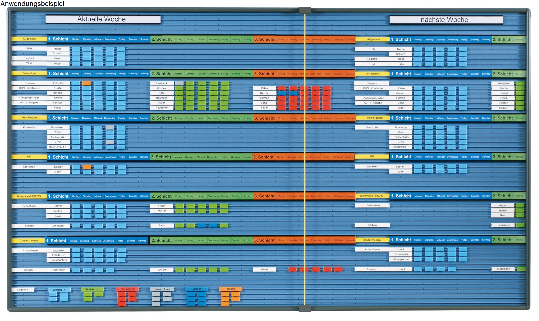 Die Stecktafel "Dynasicht" Prisma Grundausführung besteht aus Profilschienen, worauf beschriftbare Anzeige-Elemente aus Kunststoff geklipst werden. Dieser Klipmechanismus ermöglicht eine einfache Neustrukturierung oder Umplanung. Durch die farbigen Anzeigen-Elemente sind viele Informationen auf der Tafel schon von weitem zu erkennen. Die Tafeln mit modularen Prisma-Rahmen sind unbegrenzt, nach unten oder rechts erweiterbar.