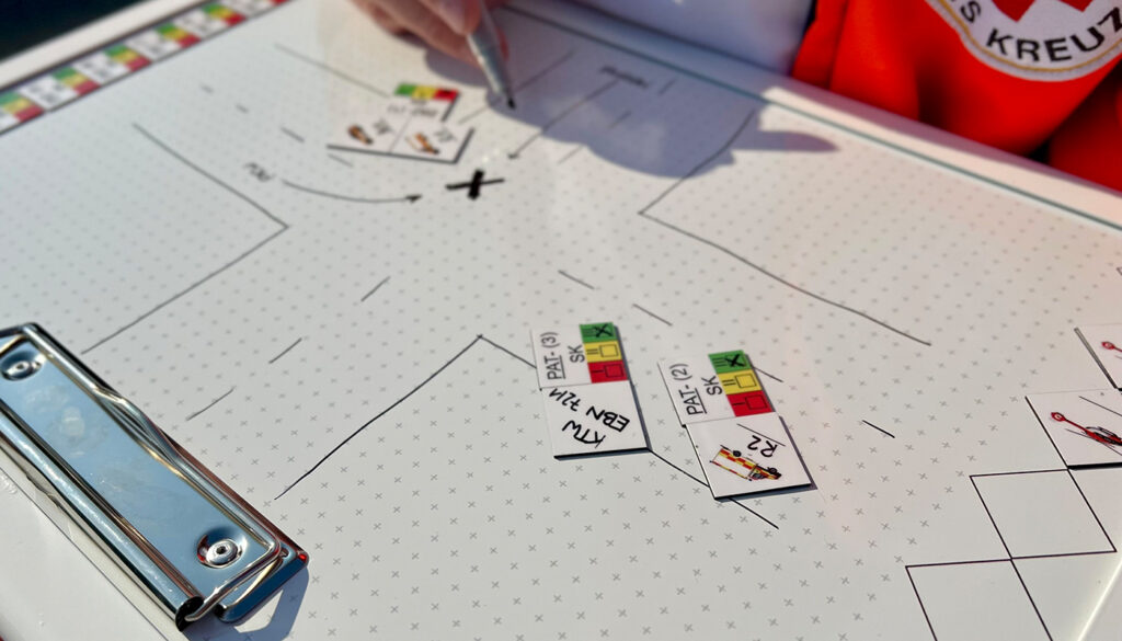 In der nächsten Tabelle werden die Patienten mit ihren Verletzungsmustern bzw. Sichtungskategorien dokumentiert. Bis zu 10 Verletzte können auf diesem Taktikboard erfasst werden. Hierbei kann man auf einen Blick sehen, an welcher Stelle Prioritäten gesetzt werden müssen.