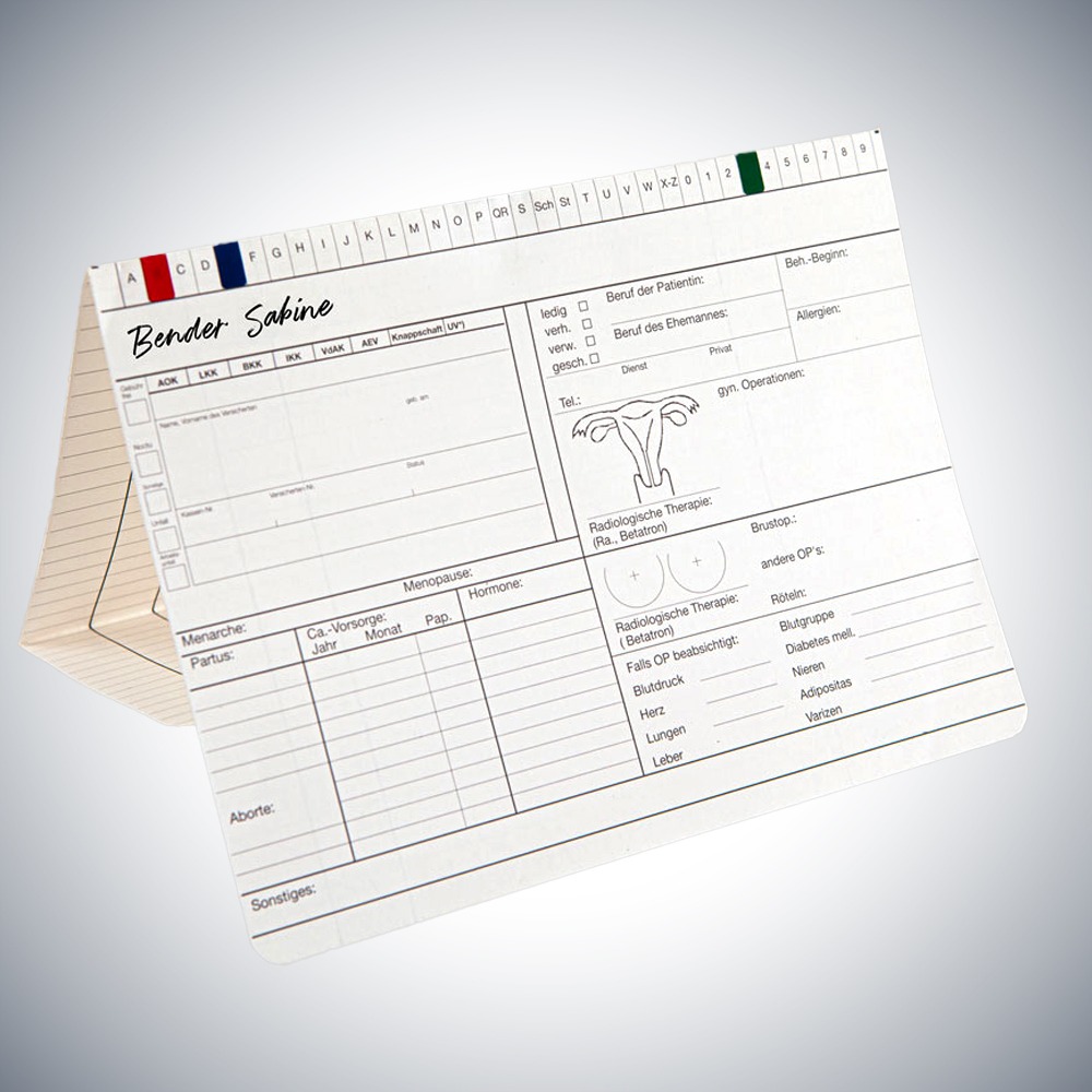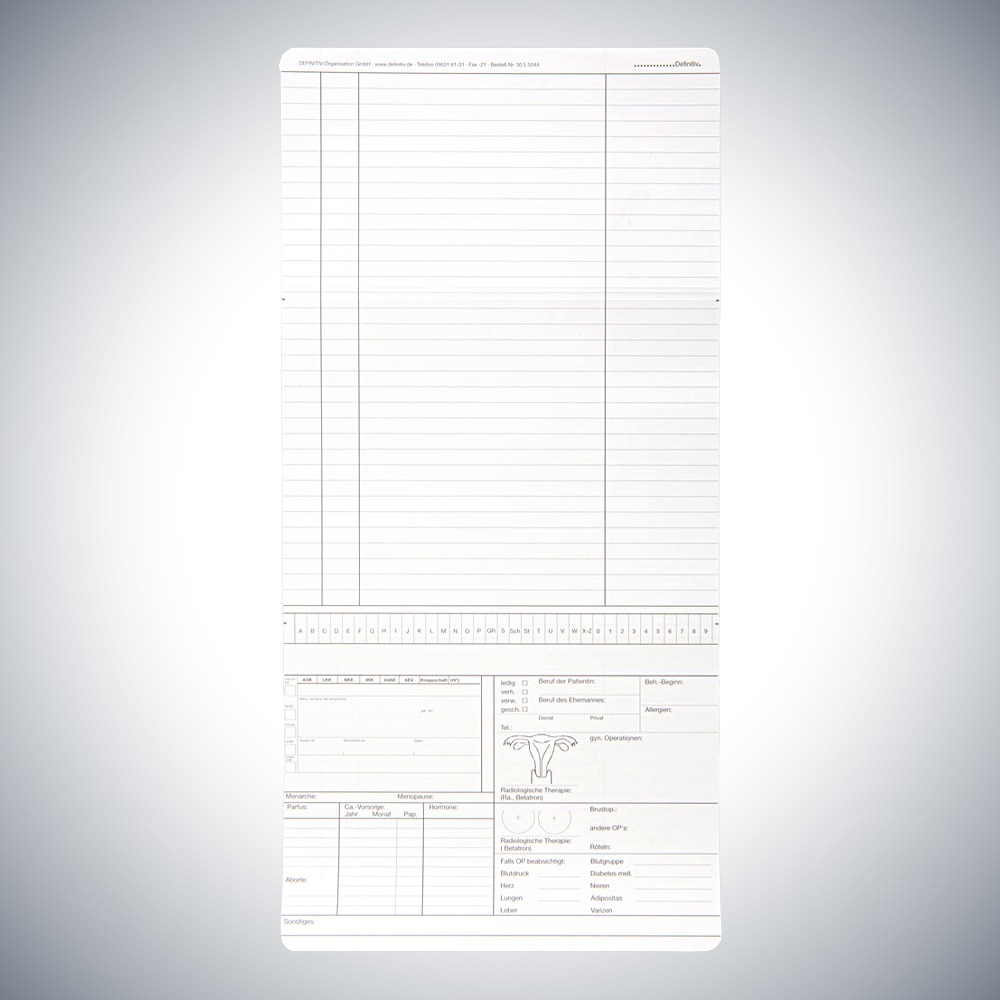 Startseite » Online Shop » Arbeitsmittel für Gesundheit » Patientendokumentation » Patientenkarteikarten » Karteikarten Arztpraxis » Karteikarte Gynäkologie DIN A5 quer – Dreifachkarte