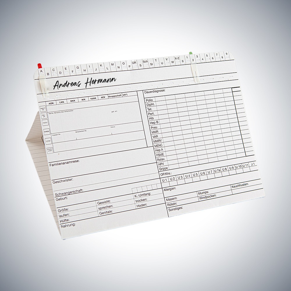 In der Karteikarte Kinderarzt DIN A5 quer werden U-Untersuchungen, Schutzimpfungen und Kinderkrankheiten einfach und übersichtlich eingetragen. Zur Dokumentation der Krankheitsgeschichte sowie des Behandlungsverlaufs ist ausreichend Platz vorhanden. Die Verwendung von Signalenreitern erleichtert das schnelle Auffinden.