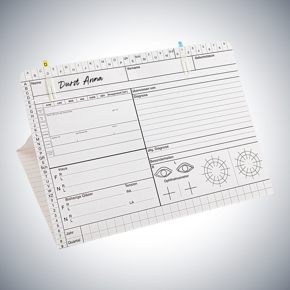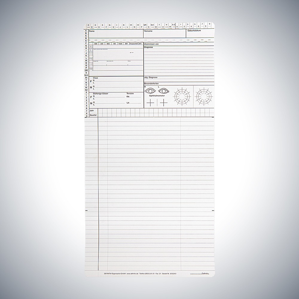 Startseite » Online Shop » Arbeitsmittel für Gesundheit » Patientendokumentation » Patientenkarteikarten » Karteikarten Arztpraxis » Karteikarte Augenarzt DIN A5 quer – Dreifachkarte