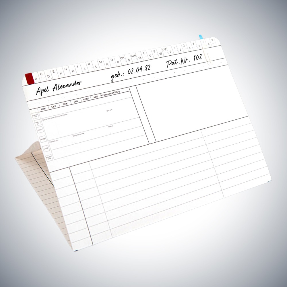 Diese stabile Karteikarte Arztpraxis DIN A5 quer für alle Fachrichtungen bietet ausreichend Platz für die ausführliche Dokumentation der Krankheitsgeschichte des Patienten. Die Verwendung von Signalreitern erleichtert das schnelle Finden in den Patientenkarteien.