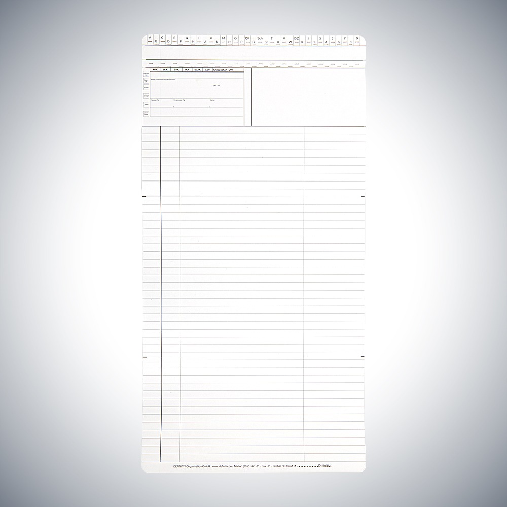 Startseite » Online Shop » Arbeitsmittel für Gesundheit » Patientendokumentation » Patientenkarteikarten » Karteikarten Arztpraxis » Karteikarte Arztpraxis DIN A5 quer für alle Fachrichtungen – Dreifachkarte neutral (2)