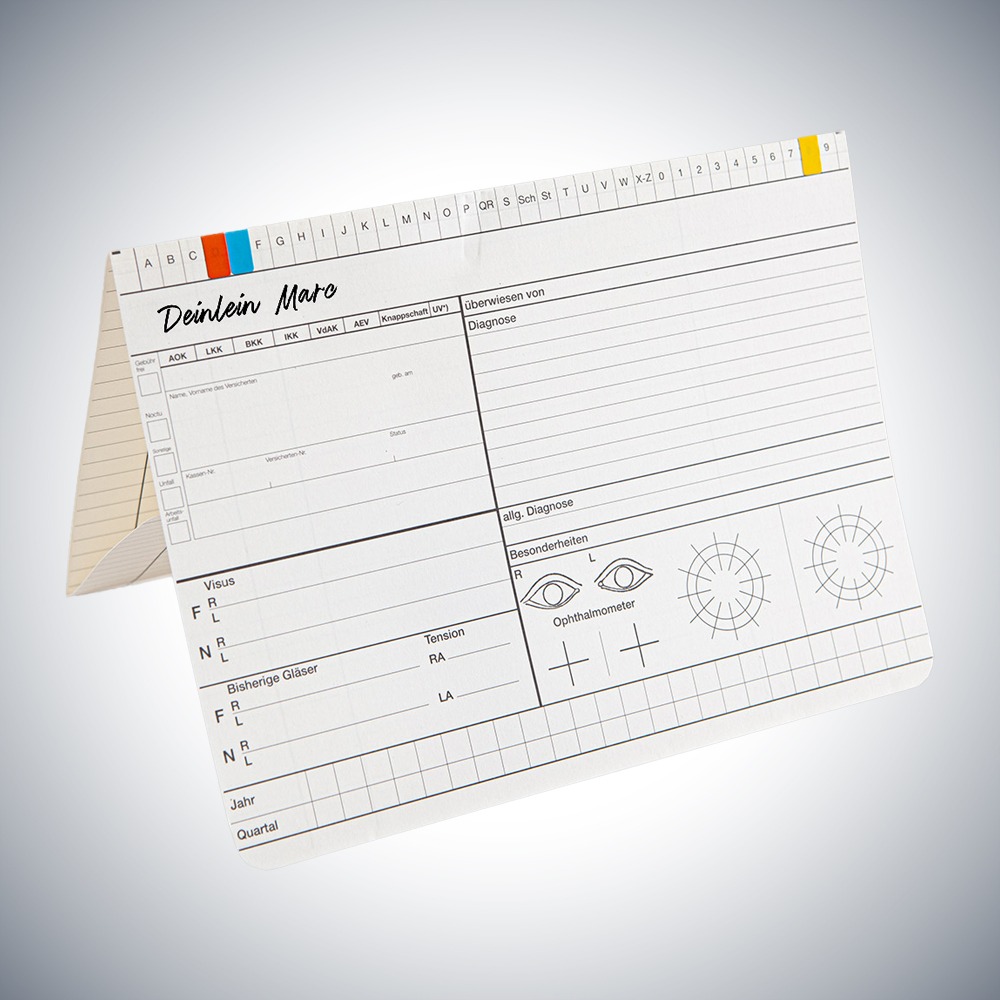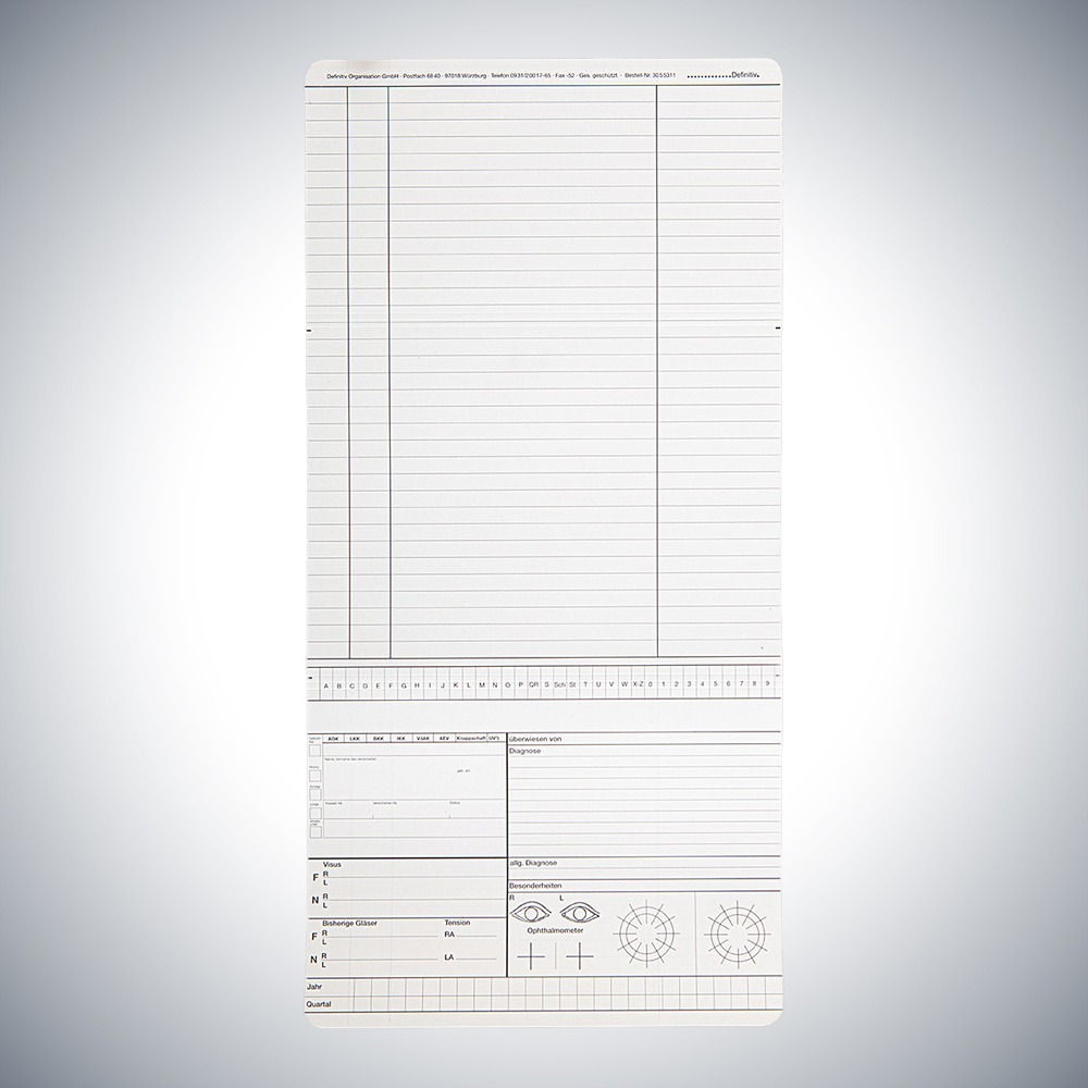 Startseite » Online Shop » Arbeitsmittel für Gesundheit » Patientendokumentation » Patientenkarteikarten » Karteikarten Arztpraxis » Karteikarte Augenarzt DIN A5 quer – Dreifachkarte