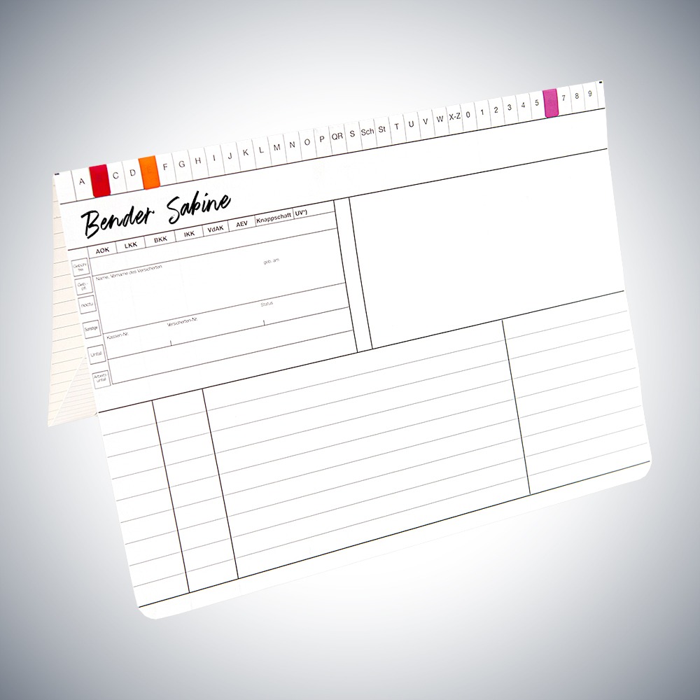 Mit dieser stabilen Karteikarte Arztpraxis DIN A5 quer für alle Fachrichtungen kann der ärztliche Befund ausführlich dokumentiert werden. Anhand von Farbmarkierern können Besonderheiten gekennzeichnet werden.
