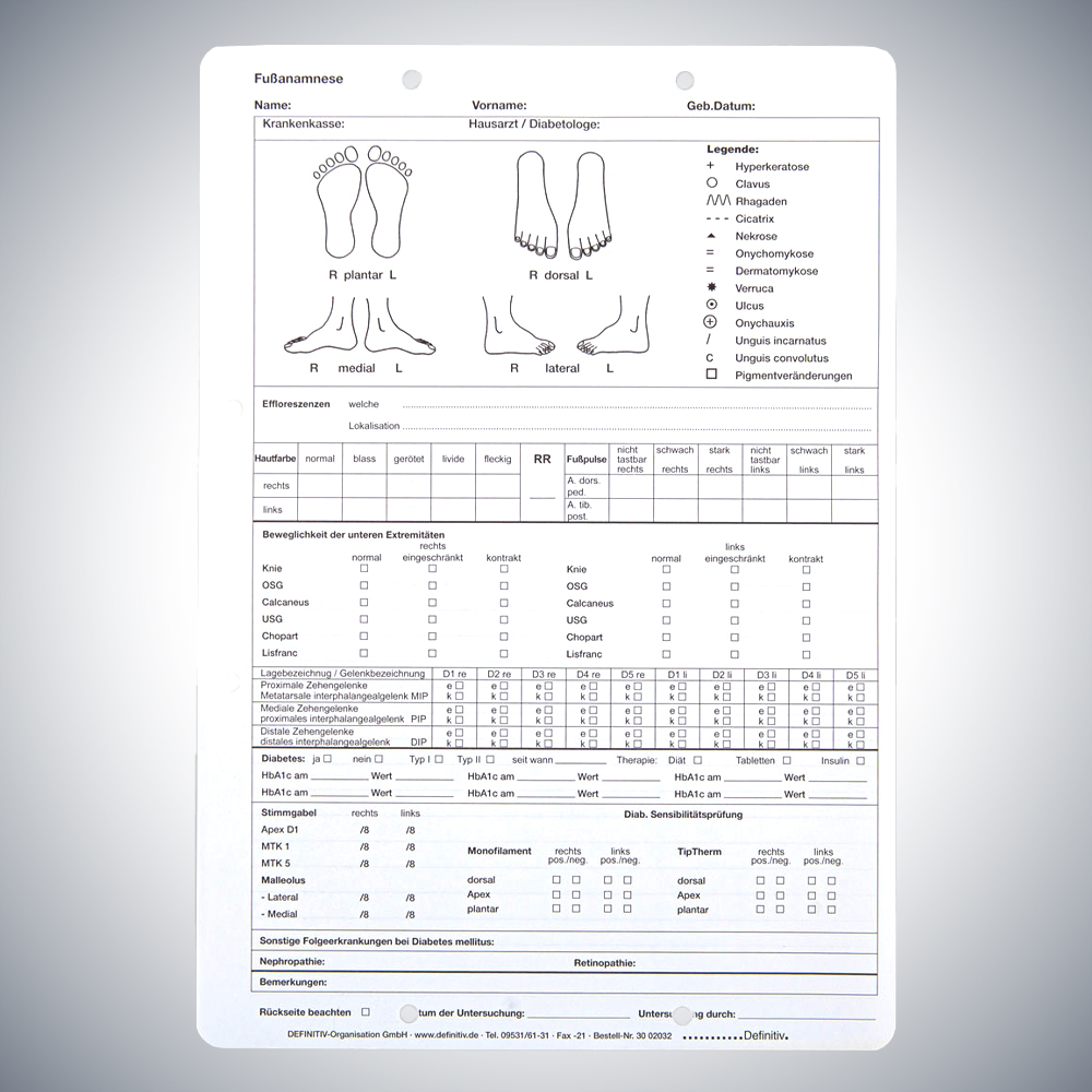 Startseite » Online Shop » Arbeitsmittel für Gesundheit » Patientendokumentation » Patientenkarteikarten » Einlegeblätter Patientenkarteikarten » Fußanamnesebogen Podologie