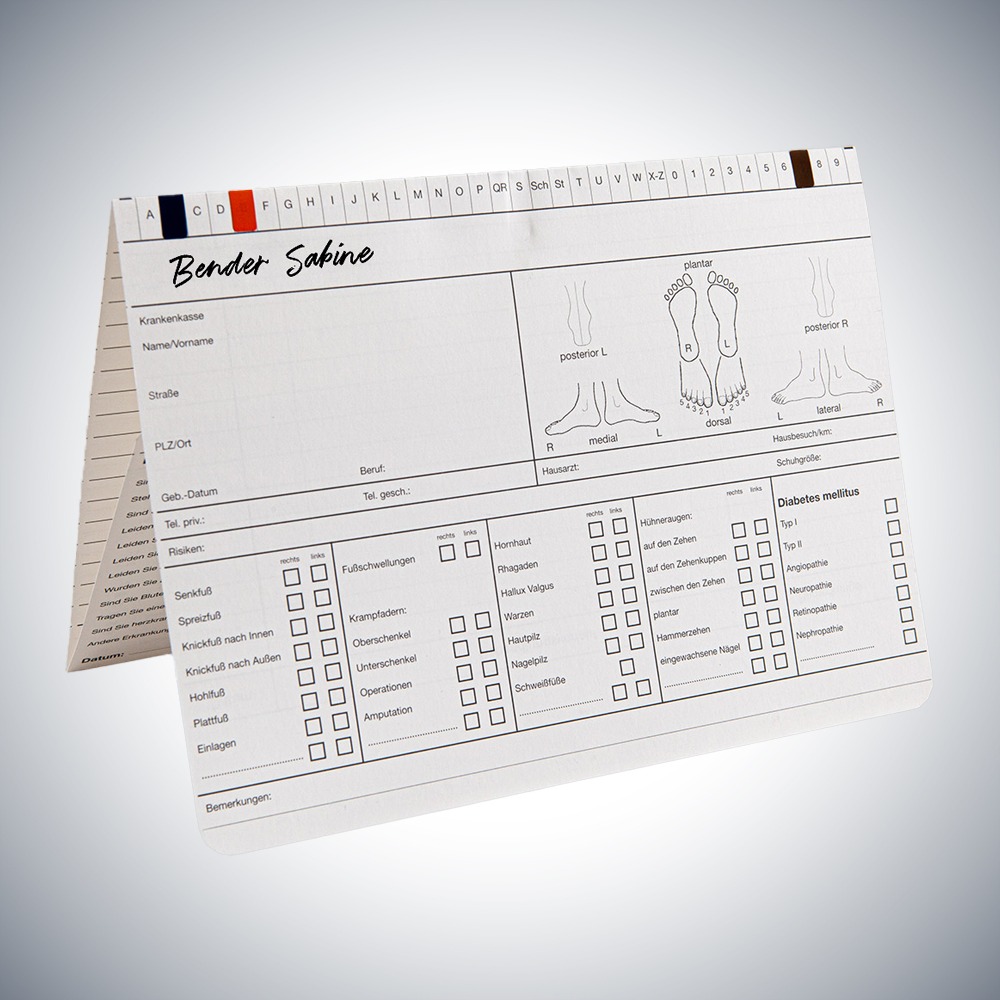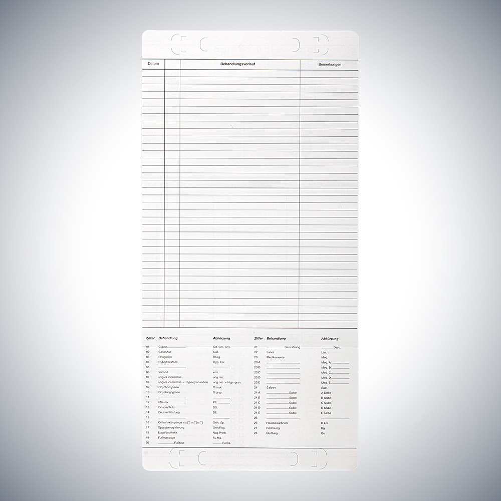 Die Karteikarte Podologie DIN A5 quer dient dem Podologen zur Befundaufnahme sowie zur Dokumentation des Behandlungsverlaufs. Mit Farbmarkieren können Besonderheiten auf der Karteikarte kenntlich gemacht werden.