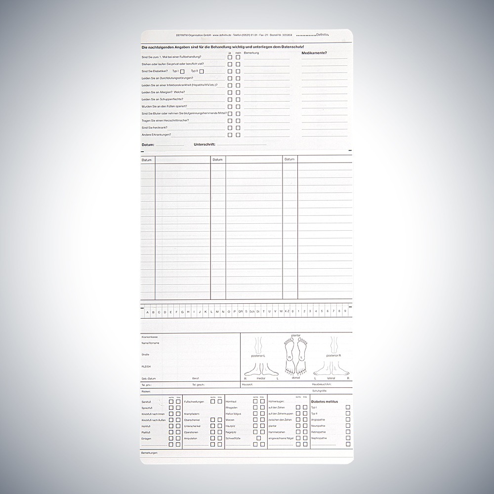 Startseite » Online Shop » Arbeitsmittel für Gesundheit » Patientendokumentation » Patientenkarteikarten » Karteikarten Fußpflege - Podologie » Karteikarte Podologie DIN A5 quer – Dreifachkarte (1)