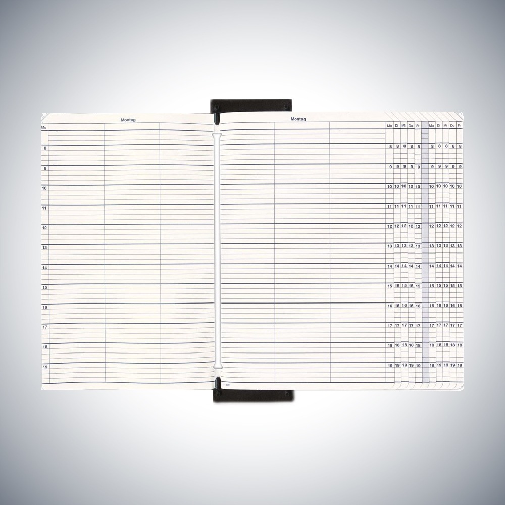 Mit diesen Termineinheiten können Sie im 15-Minutentakt durchgehend von 8.00-20.00 Uhr einfach und schnell Ihre Termine planen. Hierfür stehen 6 Spalten auf einer Doppelseite für Eintragungen zur Verfügung.