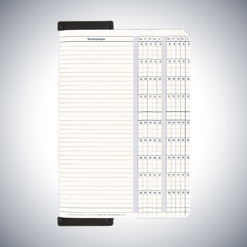 Mit diesen Termineinheiten können Sie im 15-Minutentakt von 8.00-12.00 und 14.00-19.00 Uhr Ihre Termine einfach und schnell vergeben. Hierfür stehen 2 große Spalten und 1 kleine Spalte für Eintragungen zur Verfügung. Dieses System ist ein Wende-System. Es wird immer nur auf der rechten Seite beschrieben. Wenn eine Termineinheit voll ist, kann sie gewendet und erneut genutzt werden.