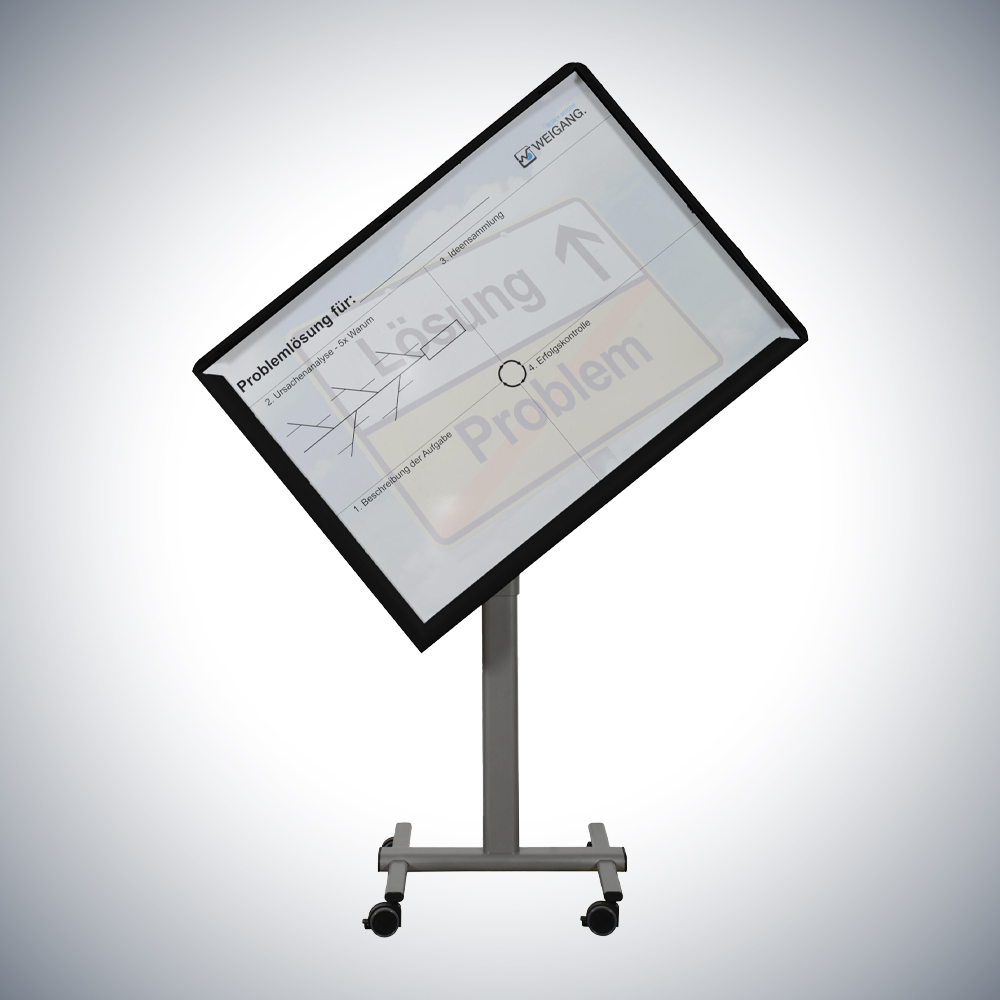 Flexible und mobile Shopfloor-Tafel. In der Ausrichtung zwischen Hoch- und Querformat schwenkbar und durch den aufklappbaren Wechselrahmen lassen sich die entsprechenden Shopfloor-Vorlagen schnell und einfach austauschen.