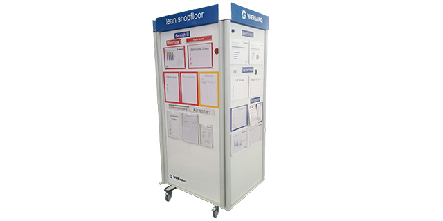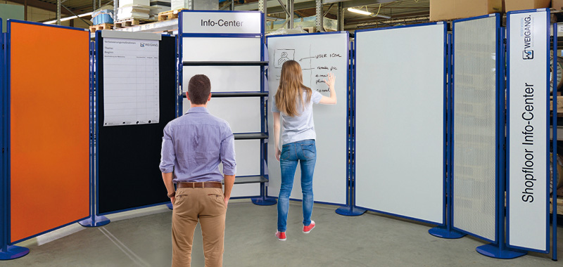 Sie brauchen mehr Platz für Informationen? Dann ist der Shopfloor Infocenter, das passende Shopfloor Management Tool für Sie. Er besteht aus einem Baukastensystem aus Basistafelelementen und Ovalstandrohren und ist individuell ausbaubar. Auch Laptop, Bildschirm und Tastatur sind integrierbar. Auf Wunsch werden die Tafeln mit passenden Überschriften versehen und mit Farben und Logo Ihrer Corporate Identity angepasst.