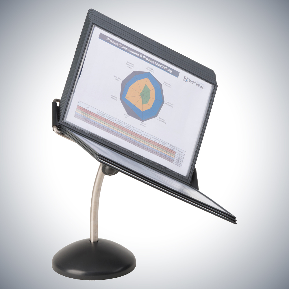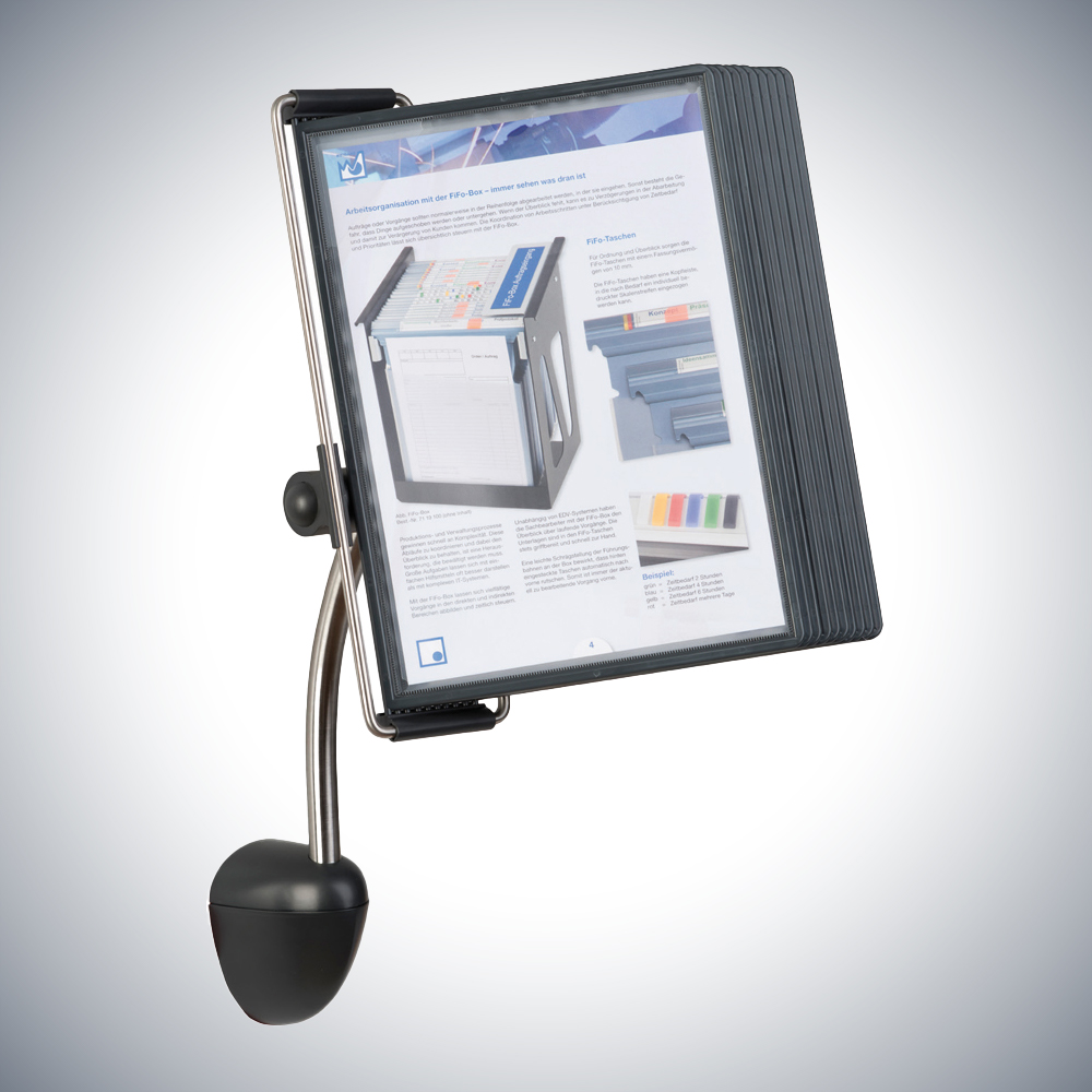 In unserem Sichttafel-Set Anthrazit zum Blättern sind Informationen im Handumdrehen parat: Telefonnummern, Adressen, Preislisten etc. Durch den Folienschutz bleiben die Dokumente auch nach häufiger Verwendung ansehnlich. Sie erhalten das Sichttafel-Set Anthrazit zur Wandmontage oder mit Standfuß zum Aufstellen für den Schreibtisch. (ohne Inhalt)