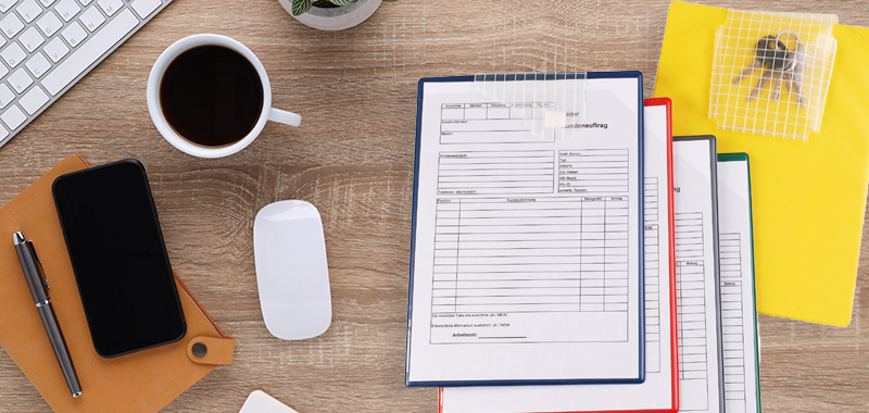 OrgaTaschen und Belegtaschen aus farbigem Kunststoff nehmen in ihren transparenten Taschen auf der Vorderseite oder beidseitig Dokumentenstapel auf. Durch die Farben erschließt sich eine visuell sofort erfassbare Informationsebene. Der Farbcode kann z.B. Auskunft geben über Bearbeitungsprioritäten, Reklamationen usw.