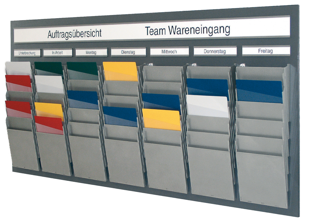 Die Variante „Auftragsübersicht Wareneingang“ besteht aus einer graphitfarbenen Basisplatte, auf der insgesamt 35 Fächer in sieben Spalten mit je fünf Fächern montiert sind. Jeder Wochentag ist einer Spalte zugeordnet. Zusätzlich gibt es die Spalten „In Arbeit“ und „Unterbrechung“ – für eine klare und strukturierte Organisation der Arbeitsprozesse.